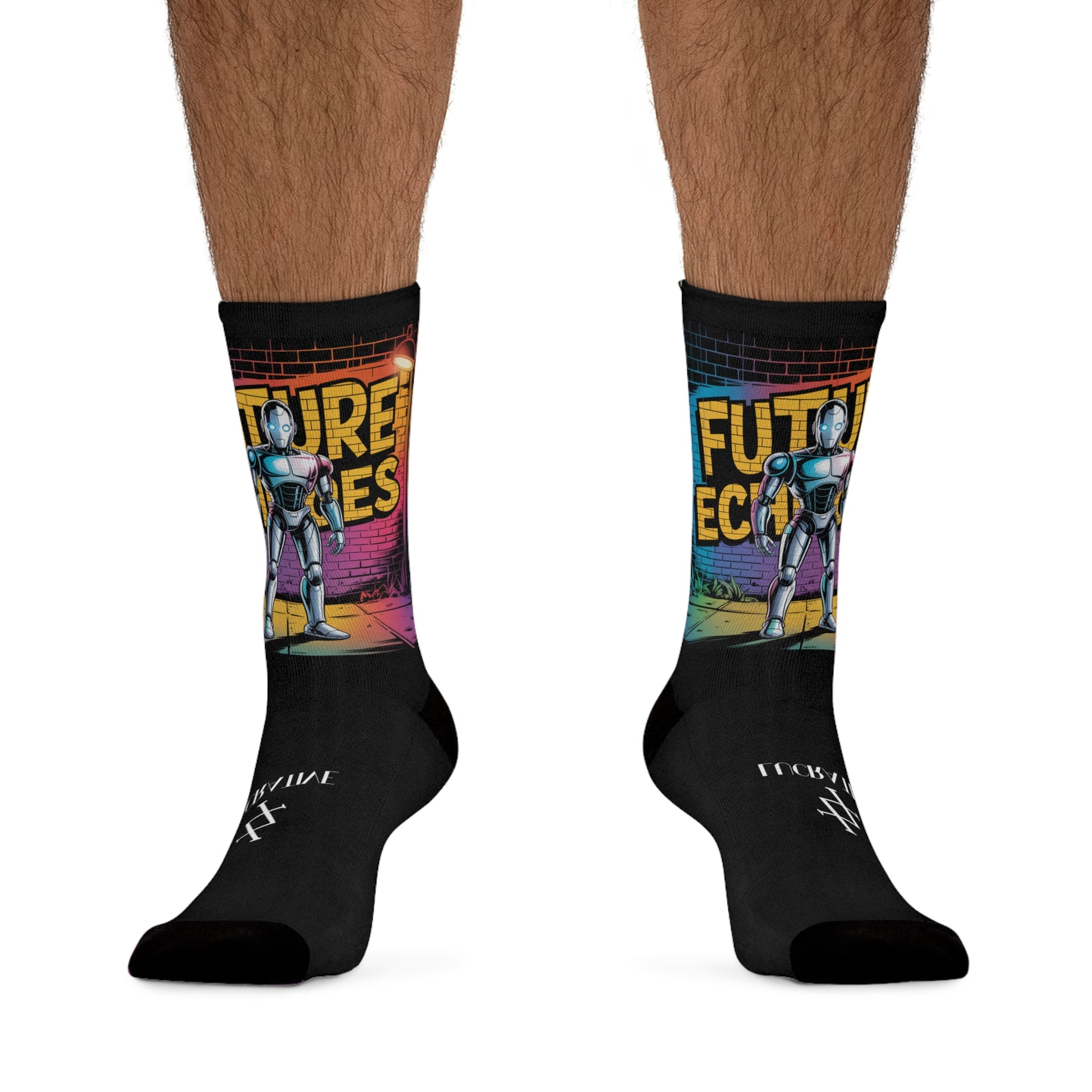 Futuristic Robot Graphic Socks — "Future Echoes" Recycled Poly Crew Socks