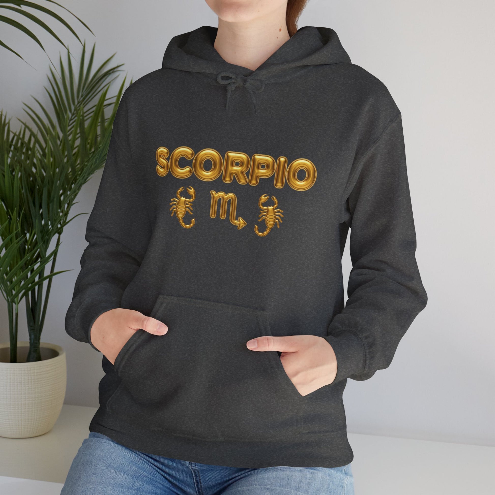 This cozy hoodie carries Scorpio energy with quiet confidence. The front shows a bold, gold-toned “SCORPIO” wordmark flanked by tiny scorpion icons and the astrological glyph. On the back a richly detailed zodiac wheel in deep blue and antique gold adds mystery and a celestial touch. Wear it on cool nights when you want to feel grounded yet a little secretive — it’s the kind of piece that settles around your shoulders and makes you want to talk about late-night plans, tarot spreads, and constellation maps. The soft, medium-weight fabric and roomy kangaroo pocket make it easy to layer over a tee or under a coat. Subtle embroidery and printed details keep the look elevated, while the double-lined hood and matched drawcords finish the design with thoughtful durability.