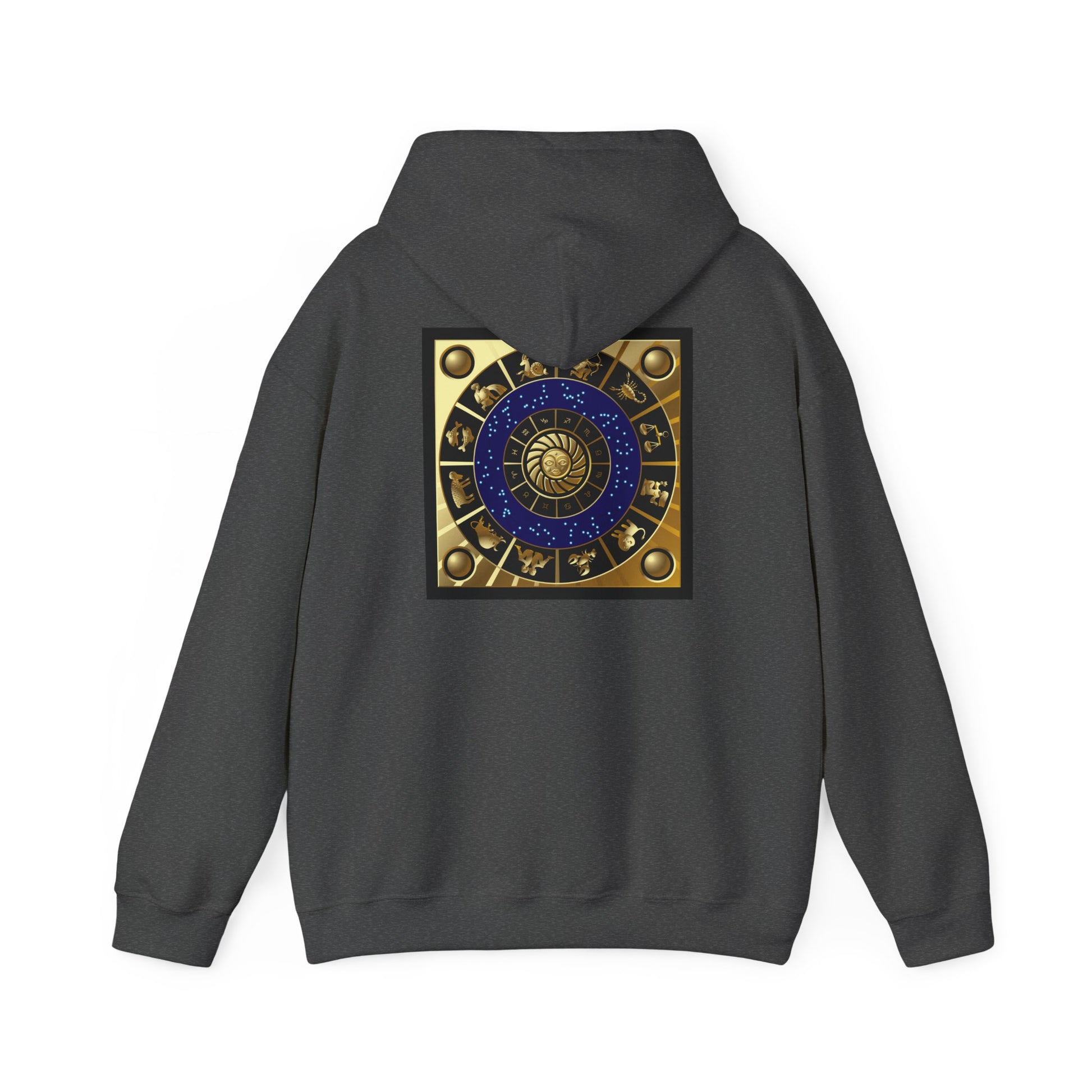 Soft, cozy, and a little cosmic — this hooded sweatshirt brings astrology to everyday wear. The front wears a warm, metallic-gold GEMINI motif with twin silhouettes and the glyph, while the back shows a jewel-toned zodiac wheel that feels like slipping into a private planetarium. It’s built for cool mornings, late-night coffee runs, and layering under jackets when the city wind bites. The roomy kangaroo pocket and double-lined hood keep hands and thoughts warm; the medium-heavy knit holds prints beautifully so the celestial artwork pops wash after wash. For someone who reads charts at midnight or just likes wearing their sign like armor, this hoodie blends comfort, durability, and a little stardust.