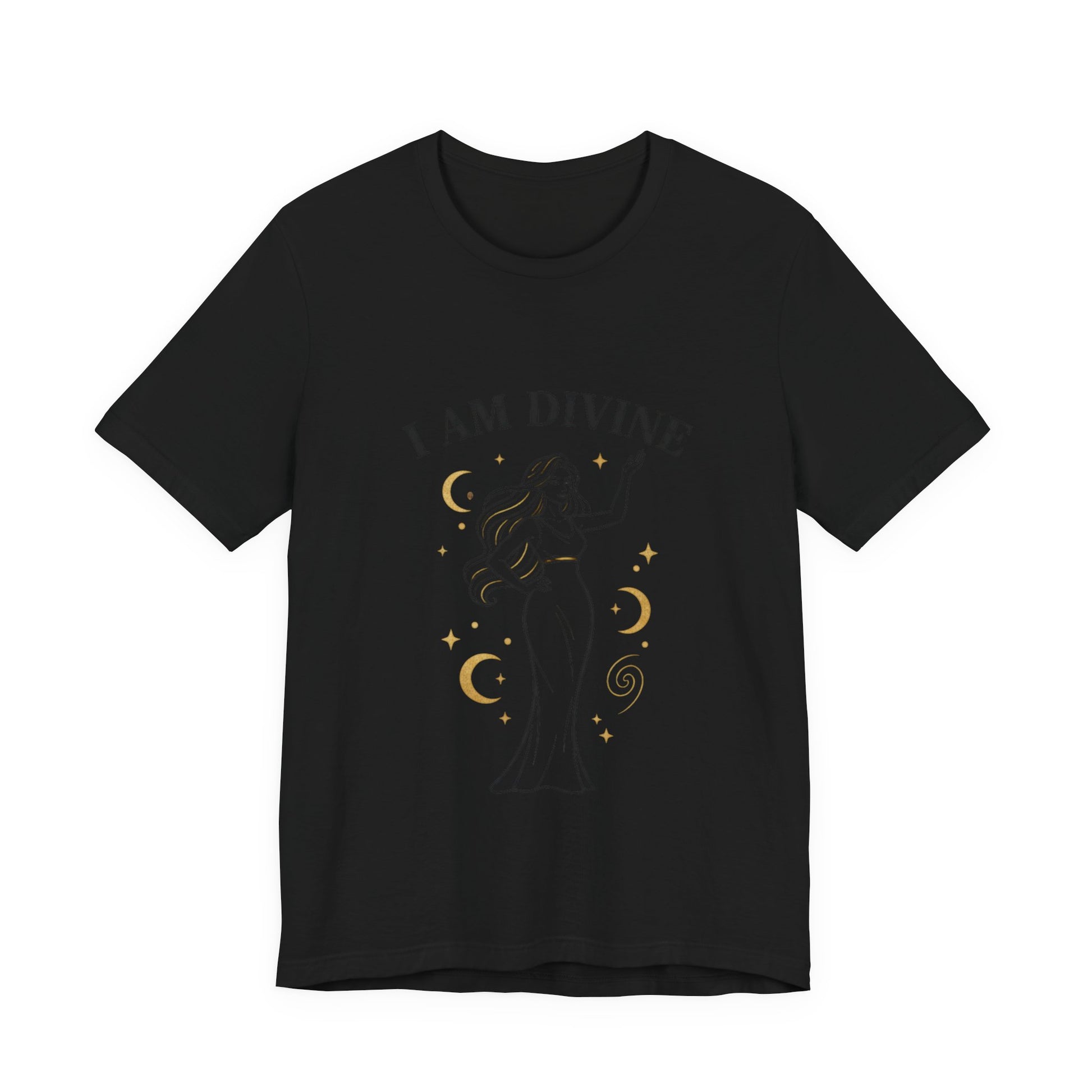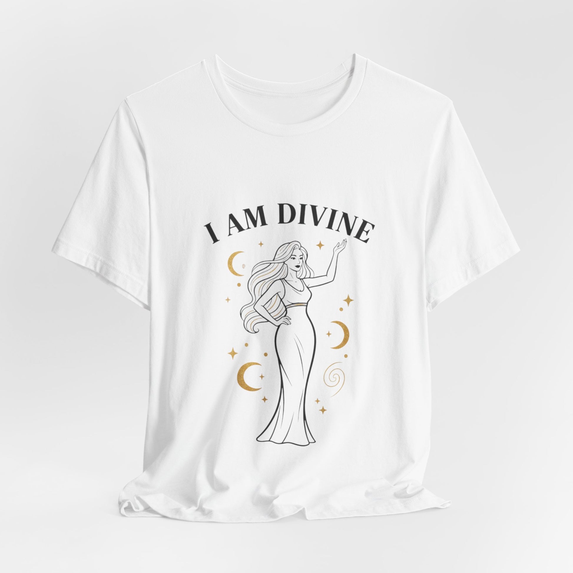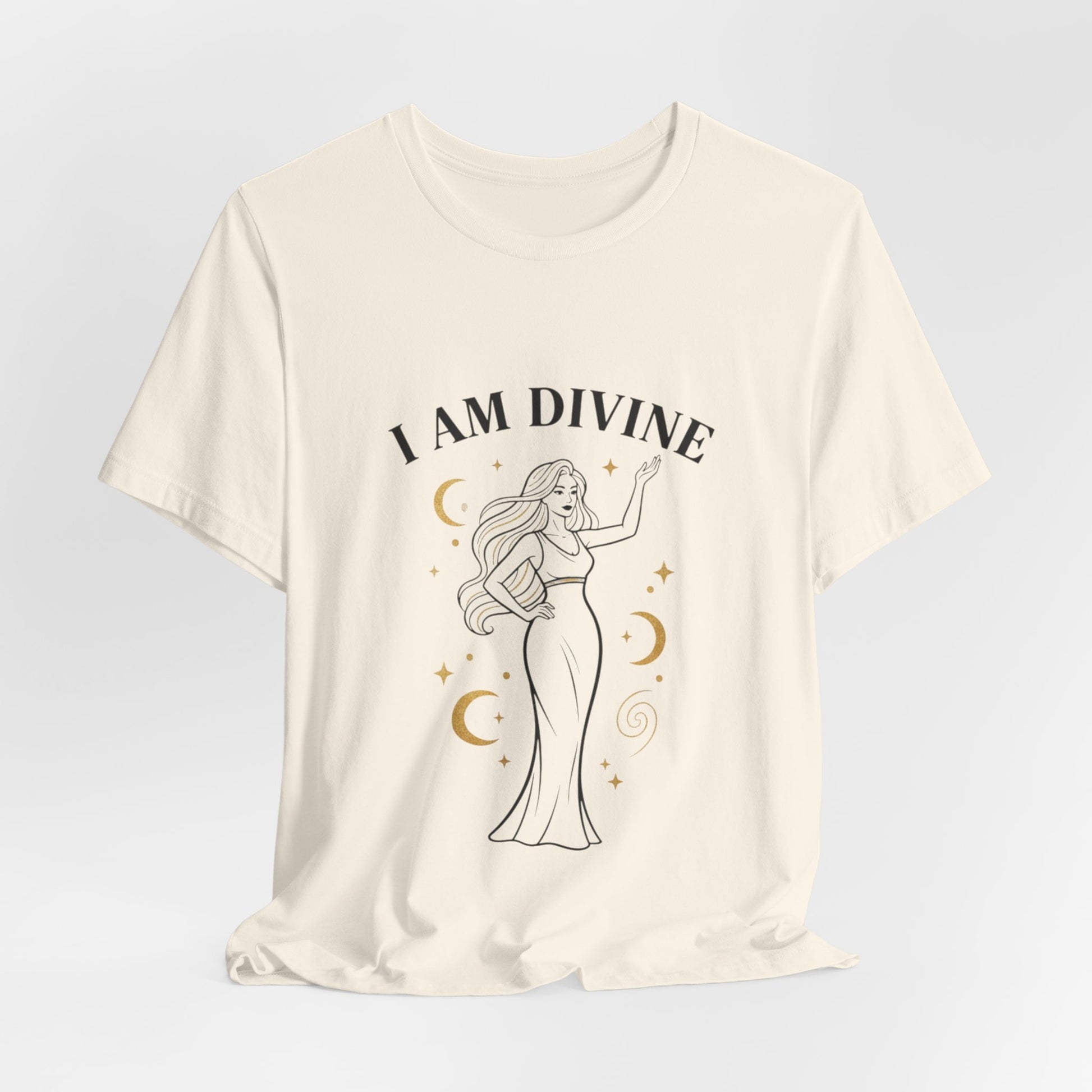 A lightweight unisex tee featuring a minimalist goddess illustration framed by laurel-inspired crescent motifs and an elegant serif affirmation: “I AM DIVINE.” Rendered in warm gold accents and fine black linework, the design blends classical marble-era cues with a modern manifesting message for everyday wear. The result is a wearable reminder of self-worth that reads like subtle mythic jewelry against luxe neutrals.