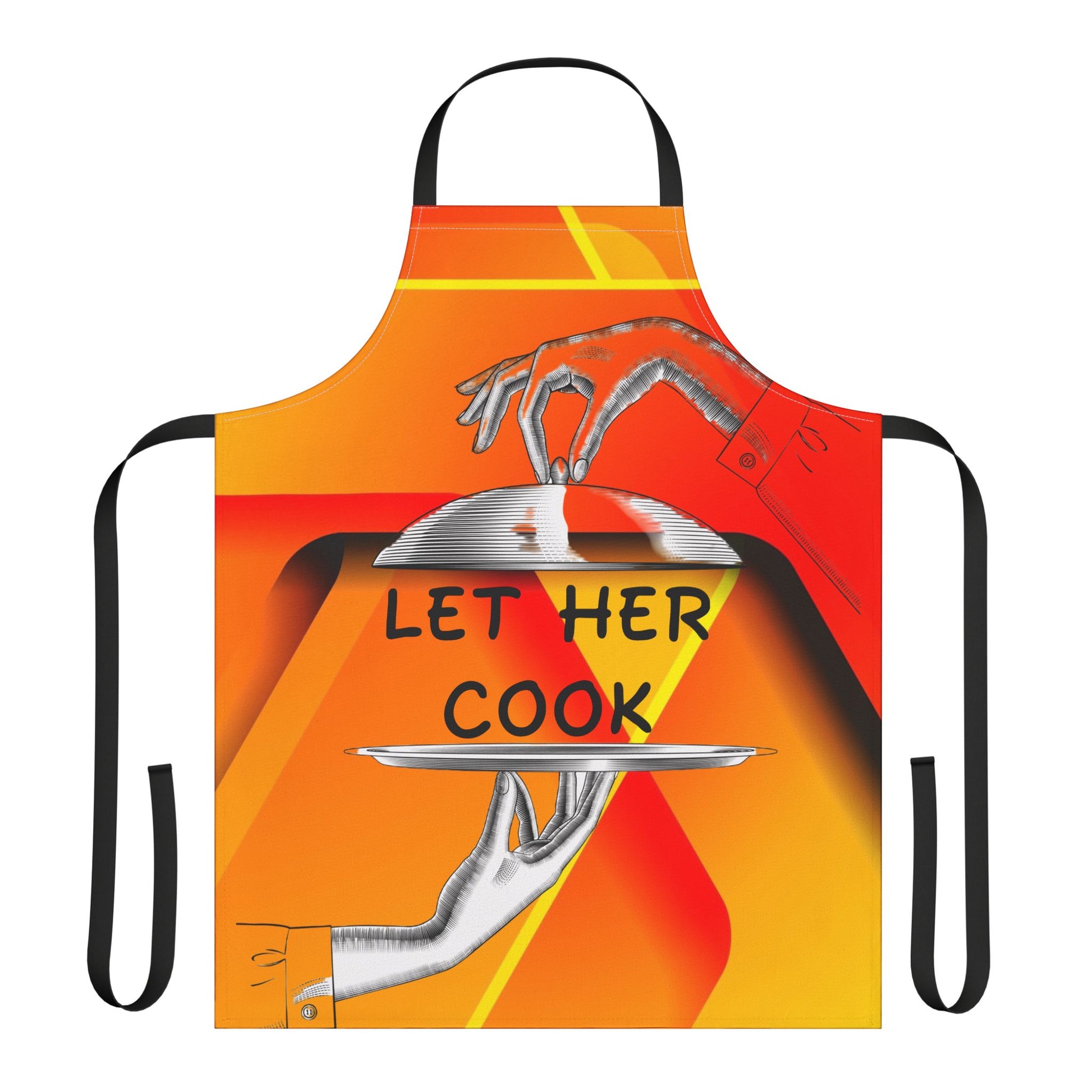 Bright, bold, and unapologetically fun—this apron brings color and personality to the kitchen. The graphic shows a server’s hand presenting a cloche with playful text that reads “LET HER COOK,” set against warm, sunset-like oranges and geometric accents. The canvas feel is smooth and slightly textured; the foam lining gives a comfortable drape while protecting clothing from spills and splatters. Choose from five strap colors to match your style or mood. Wear it while hosting a relaxed dinner, experimenting with new recipes, or adding some cheeky flair to a cooking night with friends.