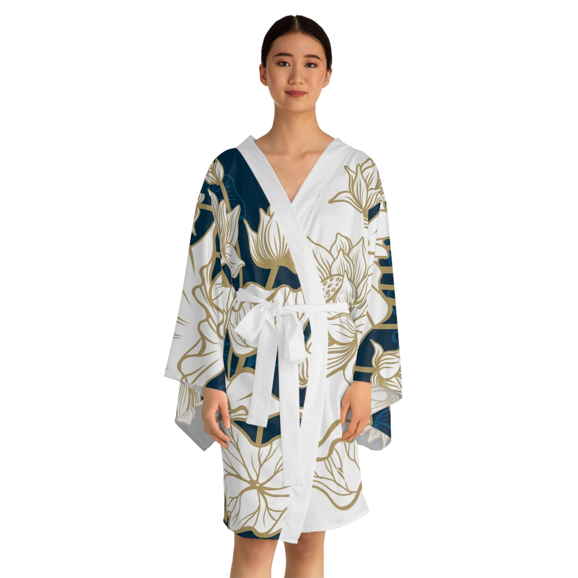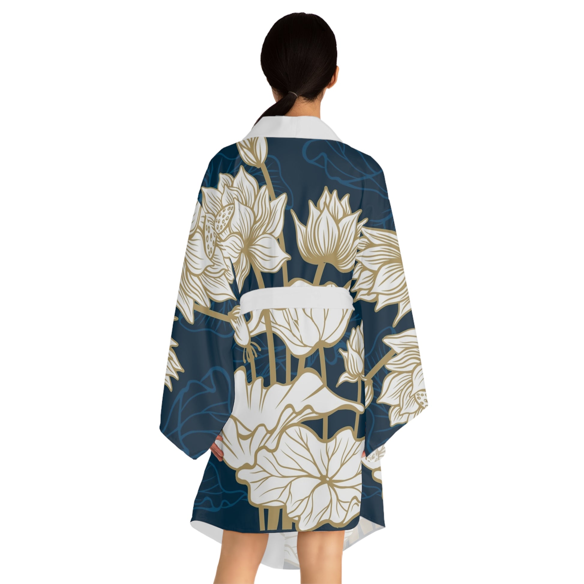 A flowing mid-length kimono robe that moves like a quiet breath of evening. The lightweight polyester drapes smoothly over the body, the bell sleeves creating soft, cinematic lines while the tie belt defines the waist. Printed with elegant lotus blooms against deep, moody indigo, this piece reads both relaxed and refined — an easy layer to slip into after a slow morning or to wear out as a standout party wrap. The robe’s figure-flattering cut and airy fabric keep you comfortable without losing polish. Note: front edge and belt come in black or white only.