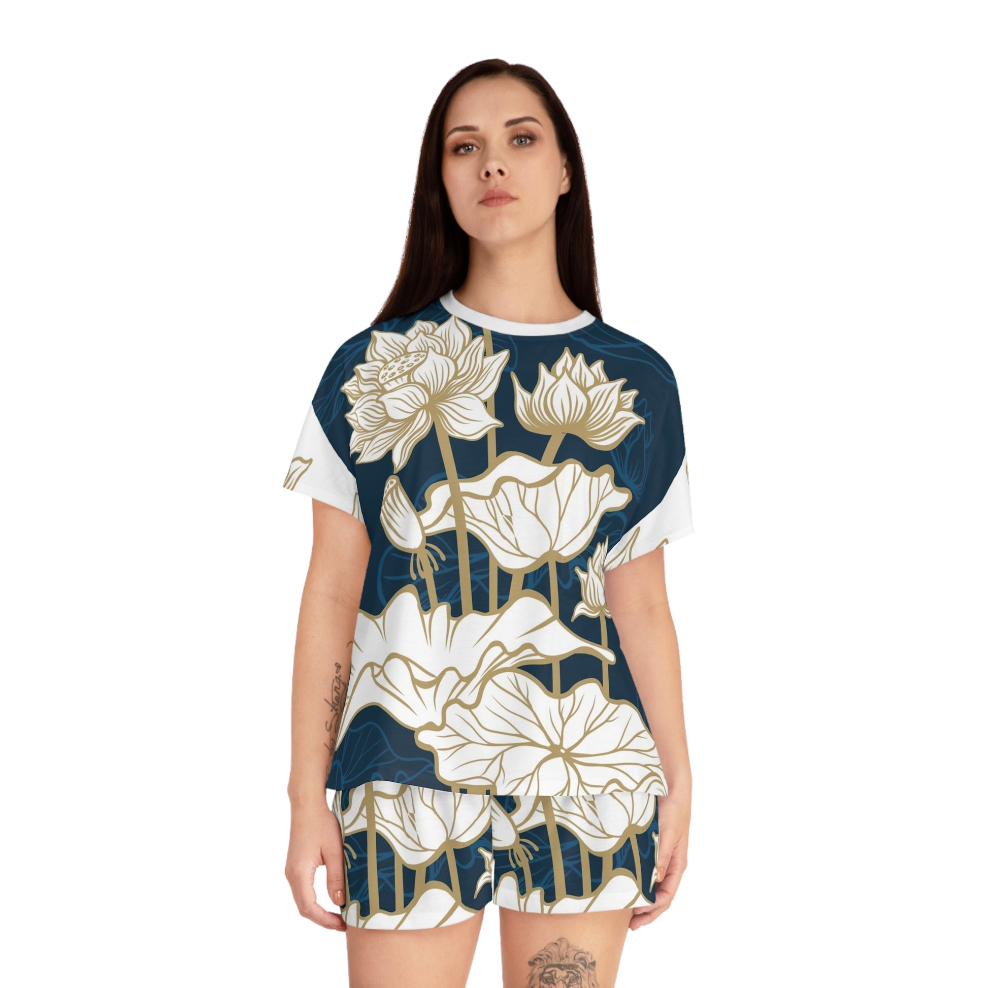 Lotus Floral Women's Pajama Set - Navy All-Over Print Short Sleepwear
