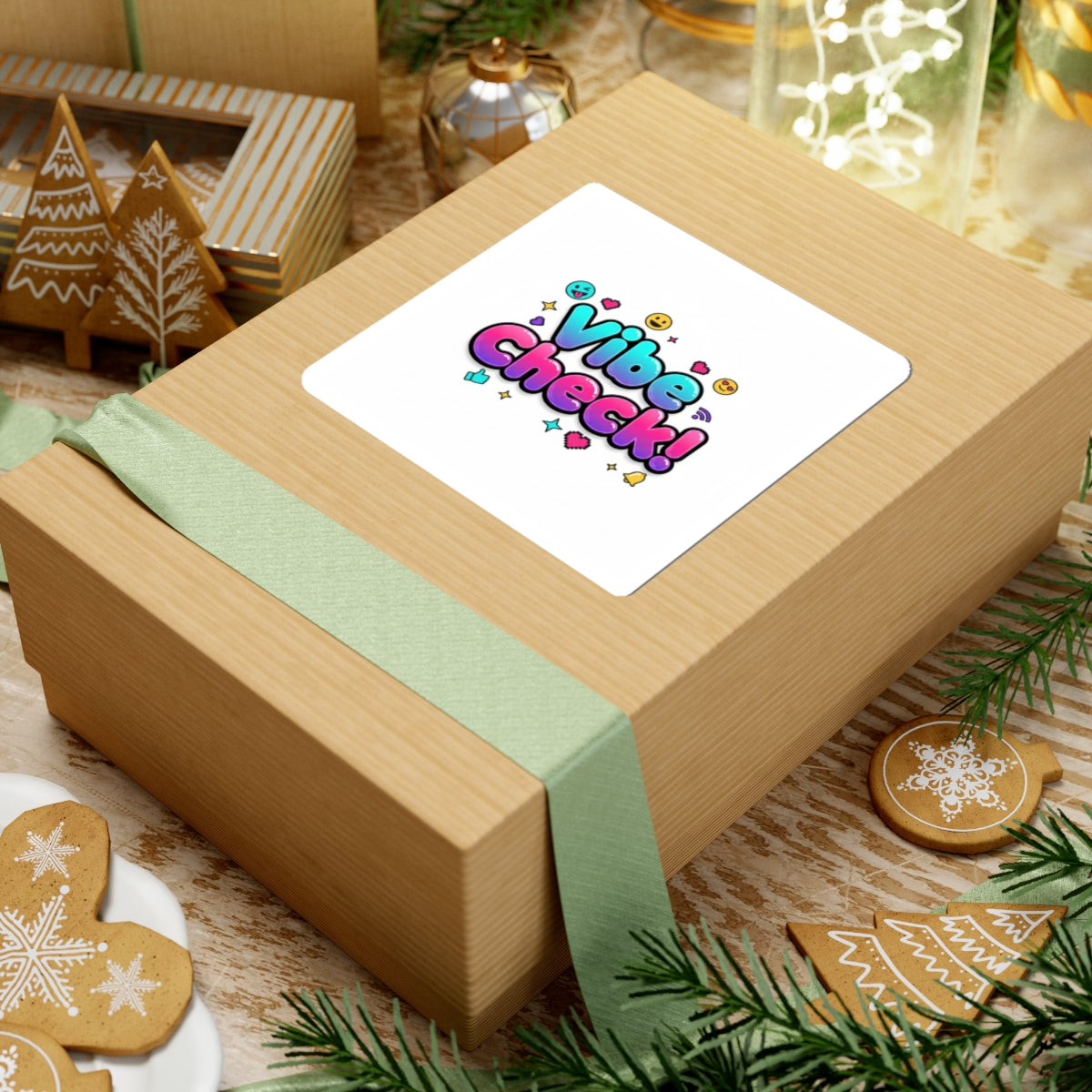 Playful, screenshot-ready sticker that channels Gen‑Z internet lingo with a bold, bubbly “Vibe Check!” phrase. Bright aqua-to-pink gradient lettering sits on a glossy white kiss-cut vinyl backed by tiny emoji and icon accents, giving a meme-friendly, social-first look that reads clearly on laptops, journals, and phone cases. The compact, scannable layout and punchy typography match the quick-turn, slang-driven trend for creators and trend-chasers who layer stickers across gear and content setups.